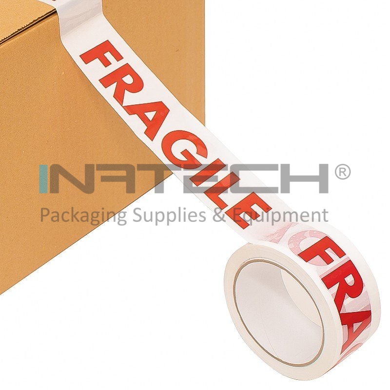 Banda adeziva personalizata FRAGIL pentru ambalare pe suport din BOPP (polipropilena biaxial orientata) cu adeziv acrilic. Banda adeziva FRAGIL este silentioasa, nu face zgomot la derulare si este un produs de atentionare cu un nivel de performanta foarte bun, fiind o alegere mai sigura si mai putin costisitoare. Aceasta banda adeziva nu necesita masuri suplimentare de siguranta ca in cazul benzilor adezive cu adeziv solvent si este rezistenta la imbatranire. Poate fi stocata si utilizata perioade lungi de timp fara a-si pierde proprietatile. Este folosita pentru sigilarea ambalajelor ce contin obiecte fragile.