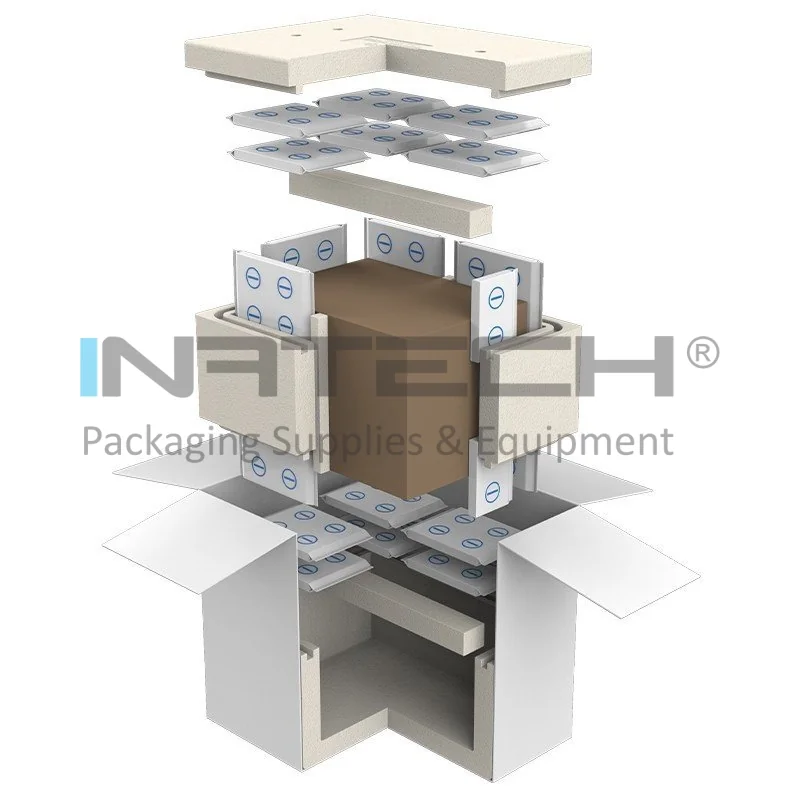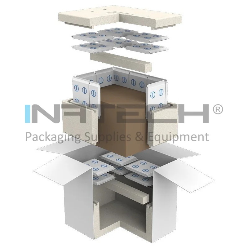 Sistemul este compus din: cutie carton exterior, cutie polistiren, cutie carton interna pentru produse si rezerve pentru racire PCM (material cu schimbare de faza) -21°C din spuma.