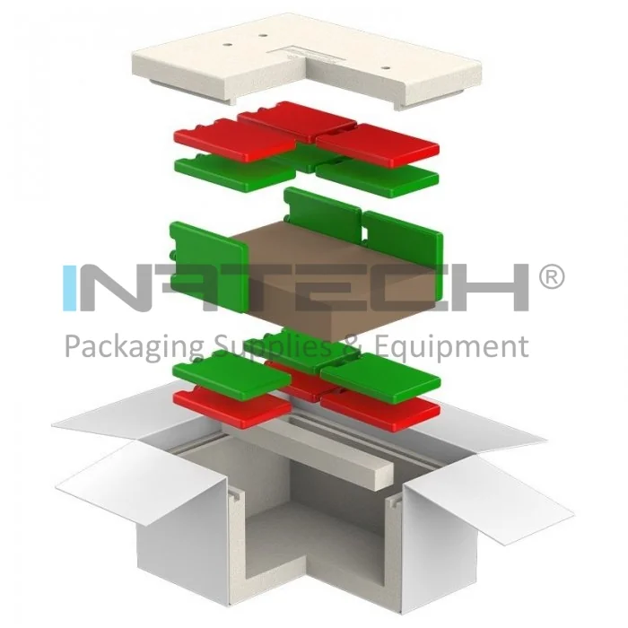 Sistemul este compus din: cutie carton exterior, cutie polistiren, cutie carton interna pentru produse si rezerve pentru racire PCM 18°C si PCM 21°C din plastic.