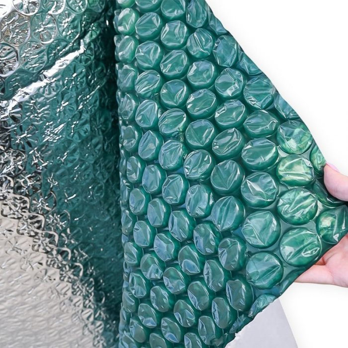 Folie Bule Mari Aluminizata obtinuta prin aplicarea unui film AL PET 24 my pe o suprafata a foliei cu bule si un film PET transparent 11 my aplicat pe partea opusa. Se obtine un produs cu proprietati excelente la socuri si vibratii si in egala masura la radiatii termice.