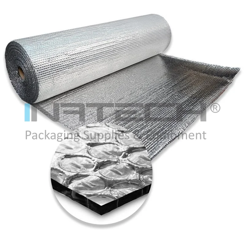 Folie Bule Mici Aluminizata este o bariera de vapori reflectorizanta compusa din folie cu bule de aer in doua straturi, laminata cu BOPP aluminizat pe o singura parte.