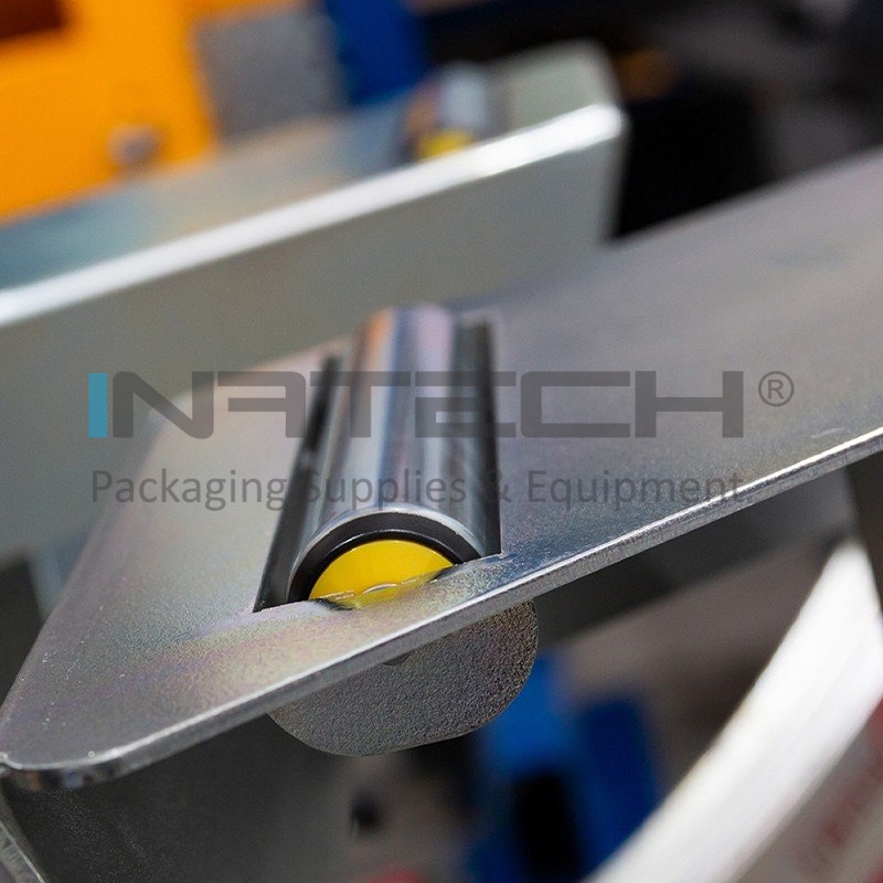 Aceasta masina de ambalare automata este destinata impachetarii coletelor cu dimensiuni circulare (anvelope, tuburi, cablaje etc) datorita rolelor incorporate in masa de lucru.
