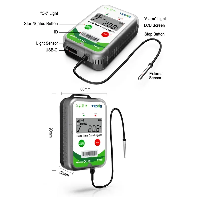 Intervalul de transmitere al datelor este de 60 de minute, iar TT19EX poate functiona pana la 60 de zile cu o singura incarcare, datorita bateriei interne reincarcabile de 3.7V/3000mAh. Acesta include un senzor de lumina, un senzor de vibratii si posibilitati de localizare prin LBS, WiFi si GPS. Monitorizarea continua permite identificarea rapida a fluctuatiilor de temperatura, deschiderea usilor sau altele evenimente care ar putea afecta produsele sensibile.